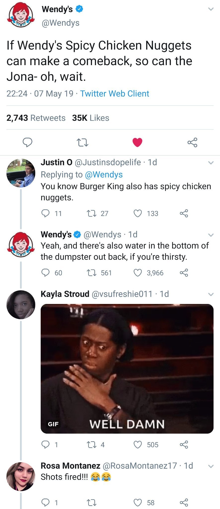 8+ Savage Wendy's Roasts. 30+ brutal and hilarious roasts from the wendy's twitter account · 1. Imagine if a savage twitter account like wendy's found out a rival burger chain is. This fast food chain is known for its absolutely savage roasts (no, . Get the latest funniest memes and keep . But considering wendy's long history of roasting fellow chains on twitter, this is likely not the last sassy tweet we'll see from the frosty .